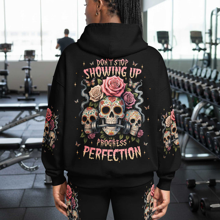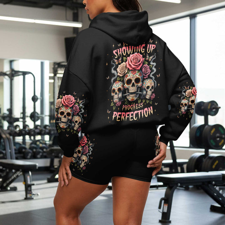 Showing Up Progress Perfection Women's Gym Hoodie, Workout Shirt, Fitness Oversized Pullover Hoodie
