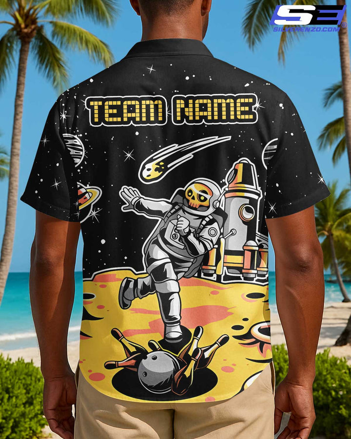 Personalized Bowling And Pins Astronaut Men Women Hawaiian Shirt Custom Name Bowling Team Jersey