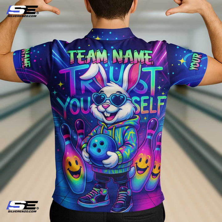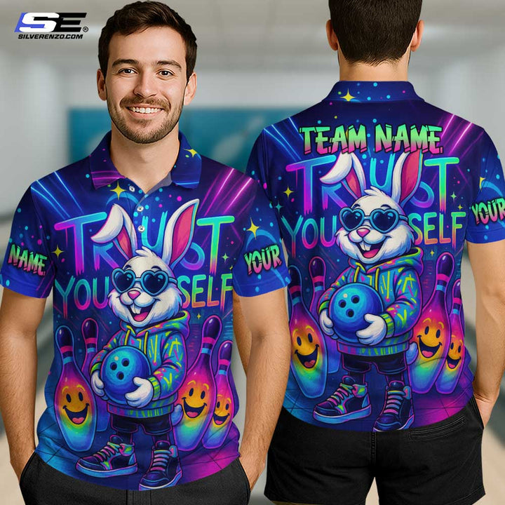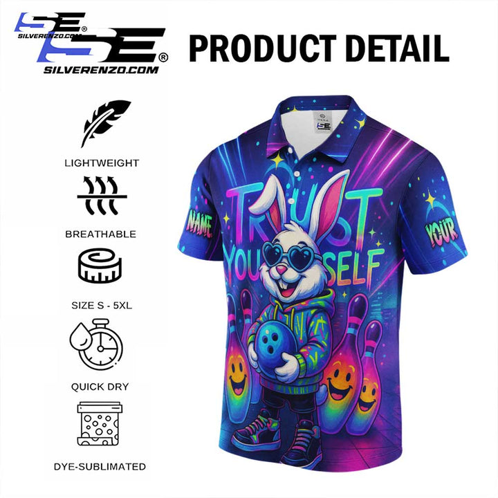 Personalized Bowling Trust Yourself Bunny Neon Men Women Performance Polo Shirt Custom Name Bowling Team Jersey