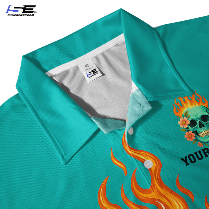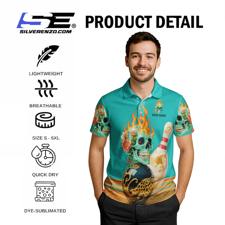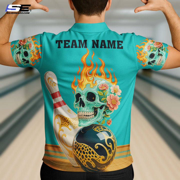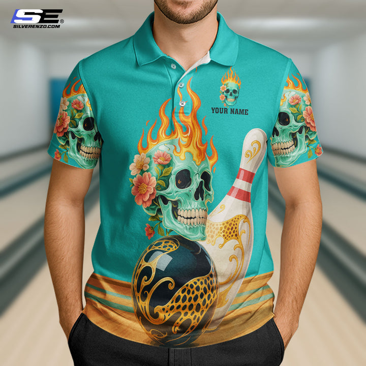 Personalized Bowling Flame Skull Floral Men Women Polo Shirt Custom Name Bowling Team Jersey