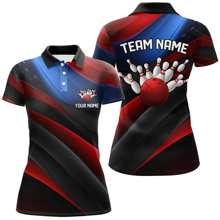 Personalized Bowling American Flag Patriotic Women Performance Polo Shirt Custom Name Bowling Team Jersey