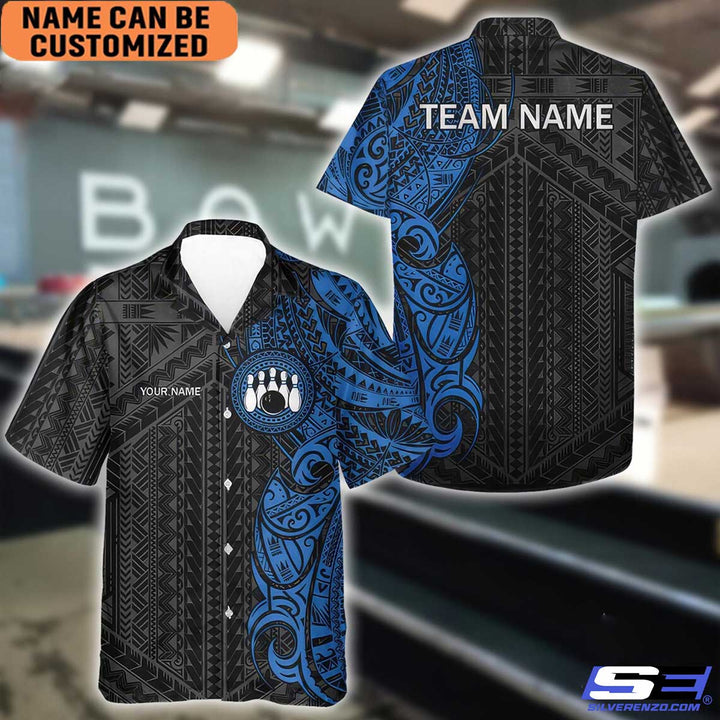 Personalized Tribal Pattern Hawaiian Bowling Shirt, Custom Black And Blue Design Button Up for Team Bowling Events or Gifts