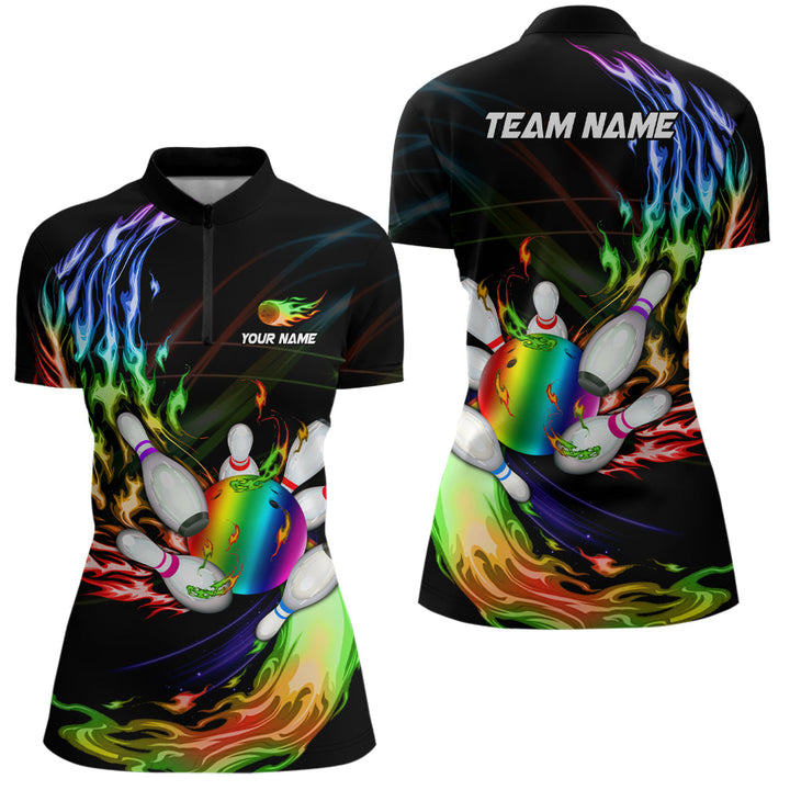 Bowling Rainbow Flame Personalized Men Women Polo Shirt Custom Bowling Team Jersey