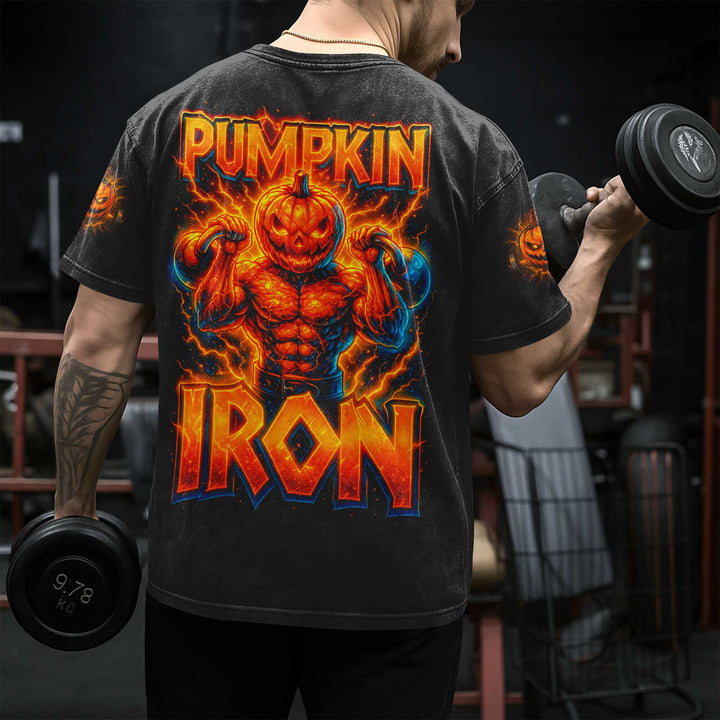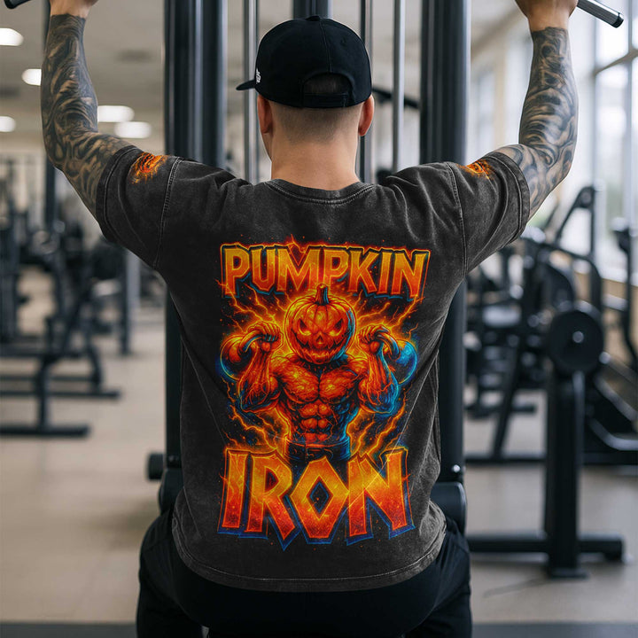 Pumpkin Iron Halloween Men's Gym T-Shirt, Workout Shirt, Oversized Pump Cover Tee